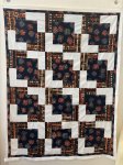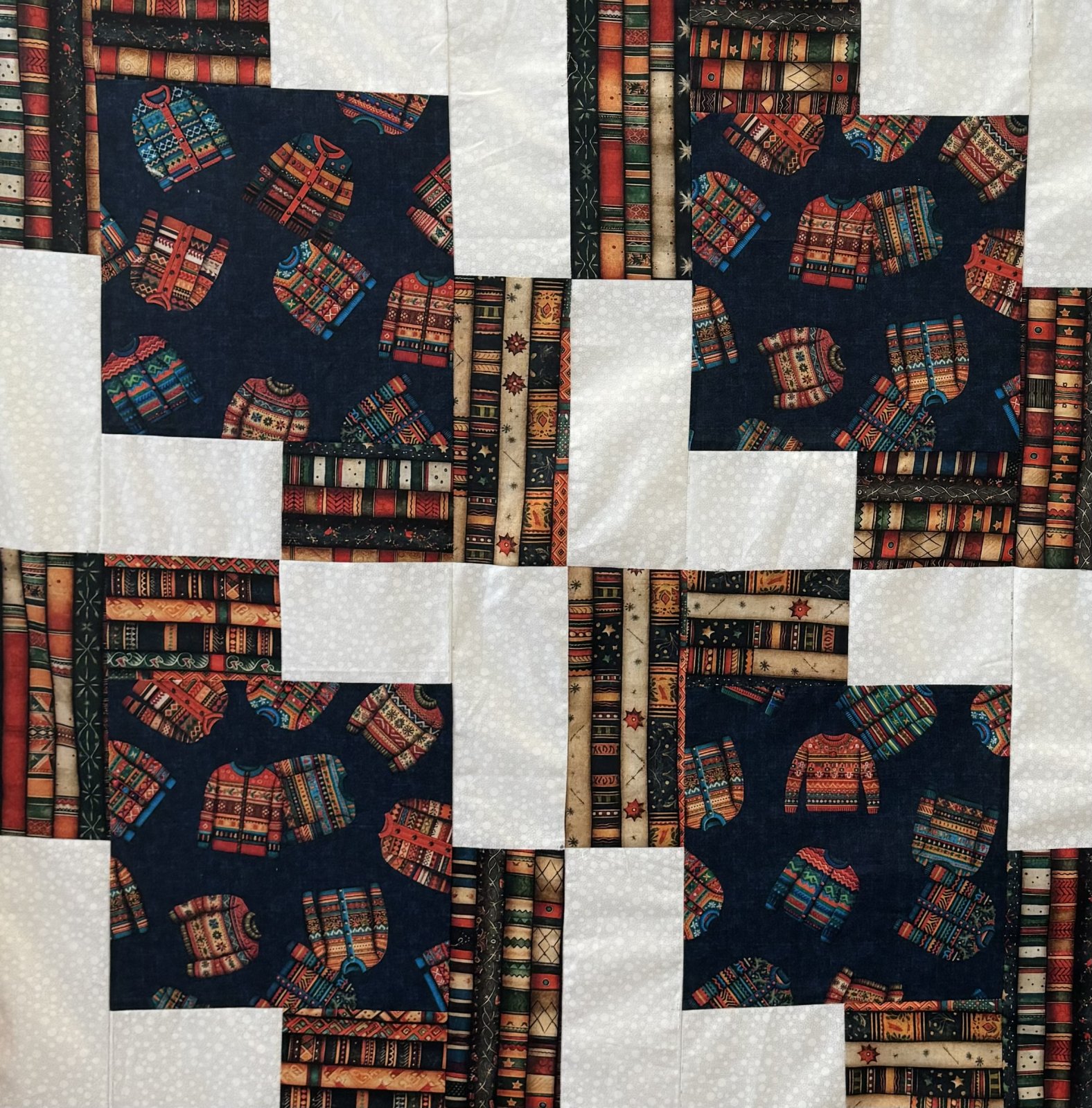 Kit includes 7/8 of a yard of green holly fabric, 1 yard of tossed presents on red fabric, 1 3/8 yard ornaments fabric, 7/8 of a yard of winter birds on black, 7/8 of a yard of winter birds and bird houses on red, 7/8 of a yard of white holly fabric, and pattern to make the Duck and Weave quilt in a Christmas themed throw size.